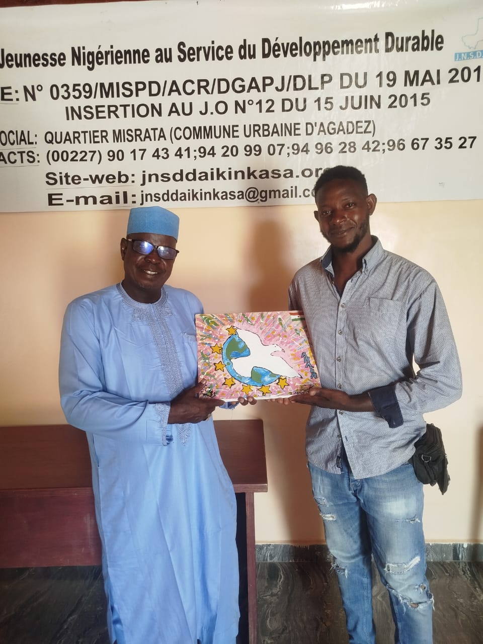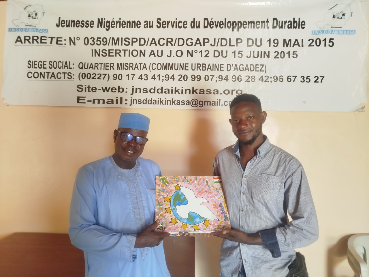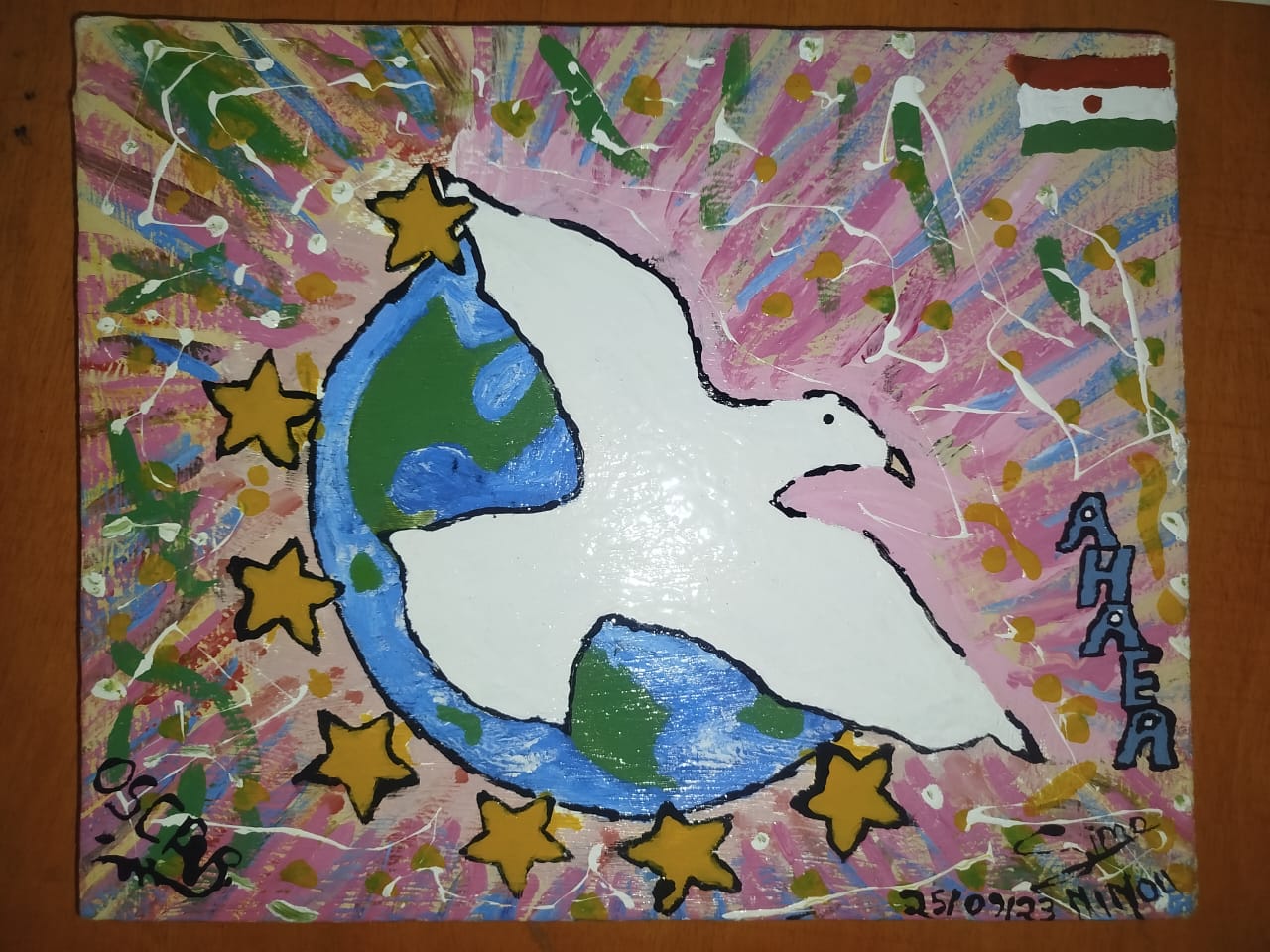 A la veille de son retour au pays natal après son séjour à Agadez au Niger et une série d’expériences les unes bonnes, les autres mauvaises un migrant expulsé de la Tunisie via l’Algérie a bien voulu témoigner sa reconnaissance au personnel de la JNSDD et à l’ensemble du groupe APS pour les multiples efforts en faveur des personnes en mobilité. Le cadeau fait à travers un tableau plein de signification a été co-signé par un autre migrant qui témoigne en sa manière de l’assistance de la dynamique APS lors de son séjour à Assamaka localité frontalière entre l’Algerie et le Niger. Ce geste humble porte une signification profonde pour nous acteurs JNSDD et APS. AHAEA, le nom d’artiste du migrant peintre est un symbole vivant de la résilience en dépit des défis auxquels il est confrontés sur son parcours migratoire.